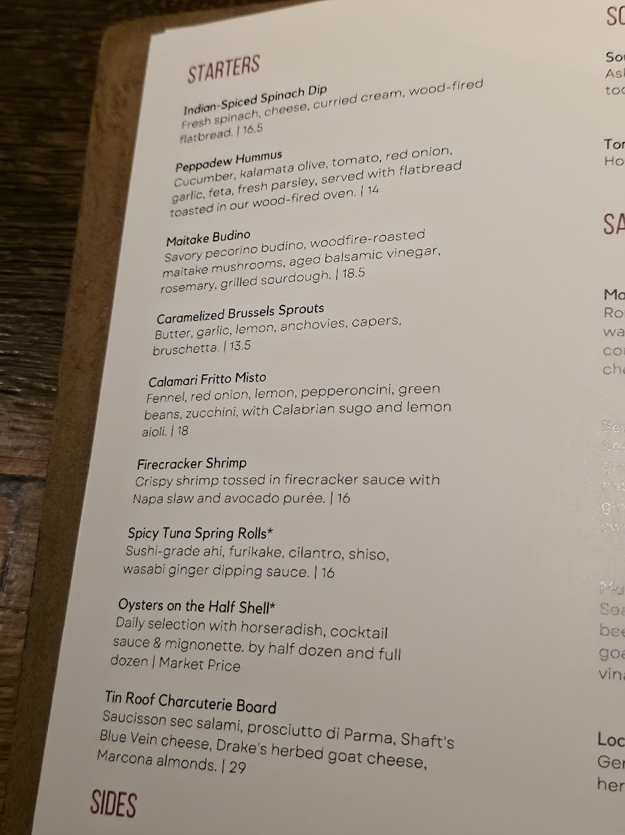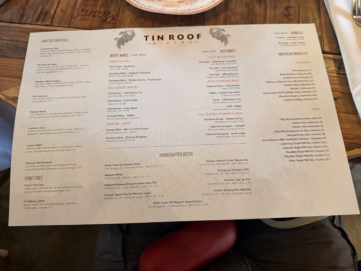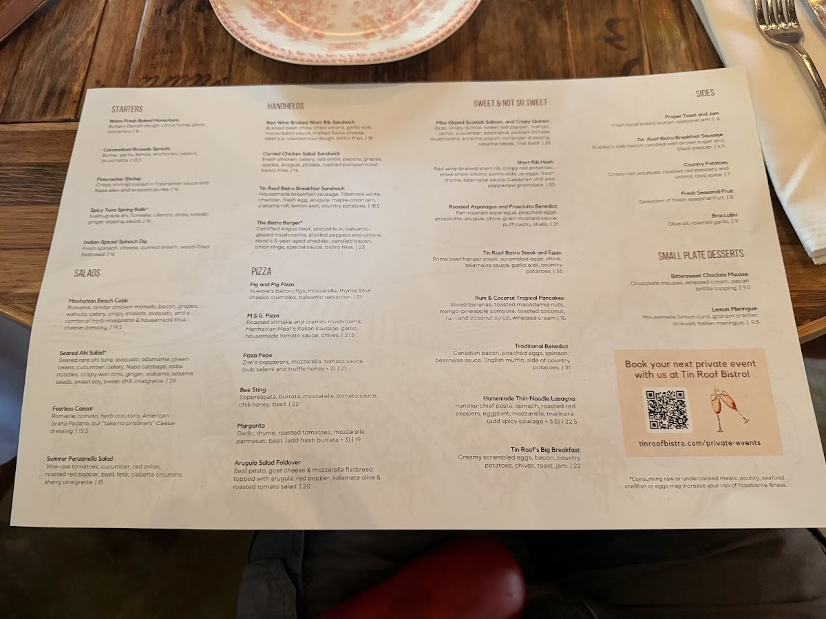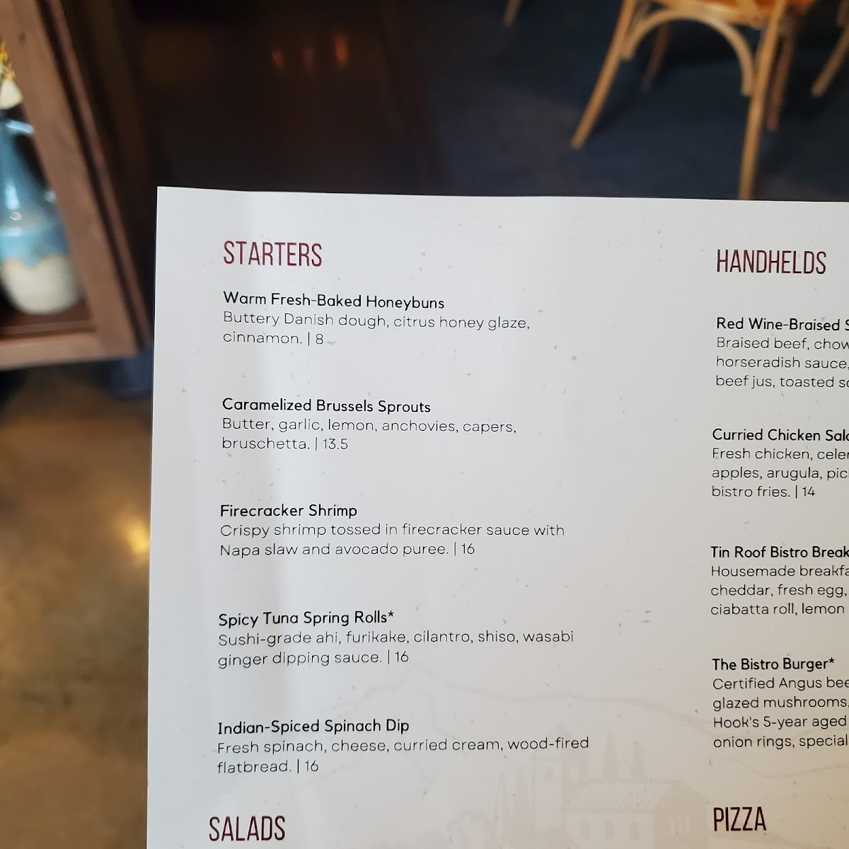 The menu at Tin Roof Bistro offers a thoughtfully crafted range of New American dishes that balance familiar comfort with creative touches. You’ll find a variety of options suitable for a relaxed lunch, casual dinner, or a lively evening out with friends. The selection includes satisfying starters like Firecracker Shrimp and Caramelized Brussel Sprouts, alongside heartier plates such as Hanger Steak Frites and Short Rib Agnolotti.